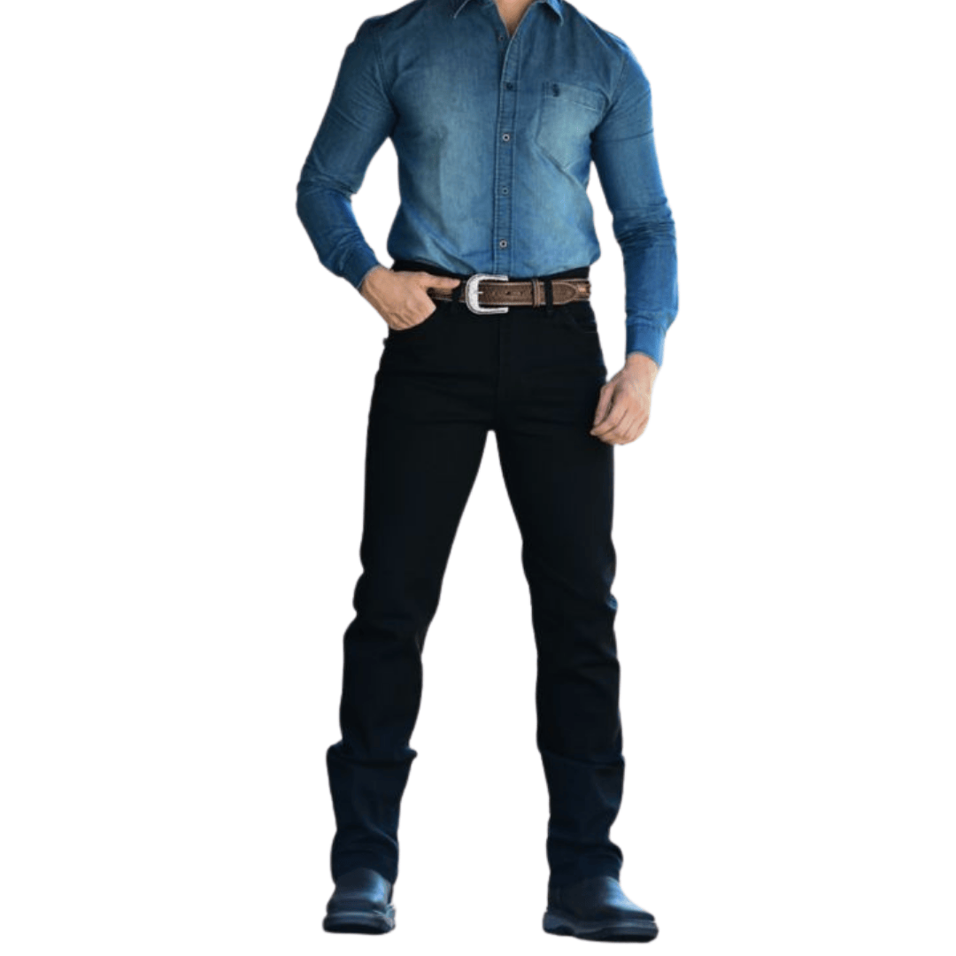 A Calça Race Bull Preta foi feita para o homem que não abre mão da autenticidade country, mas busca também liberdade e conforto em cada movimento. Produzida em tecido de alta qualidade com elastano, une resistência, flexibilidade e um caimento moderno que valoriza o visual masculino.